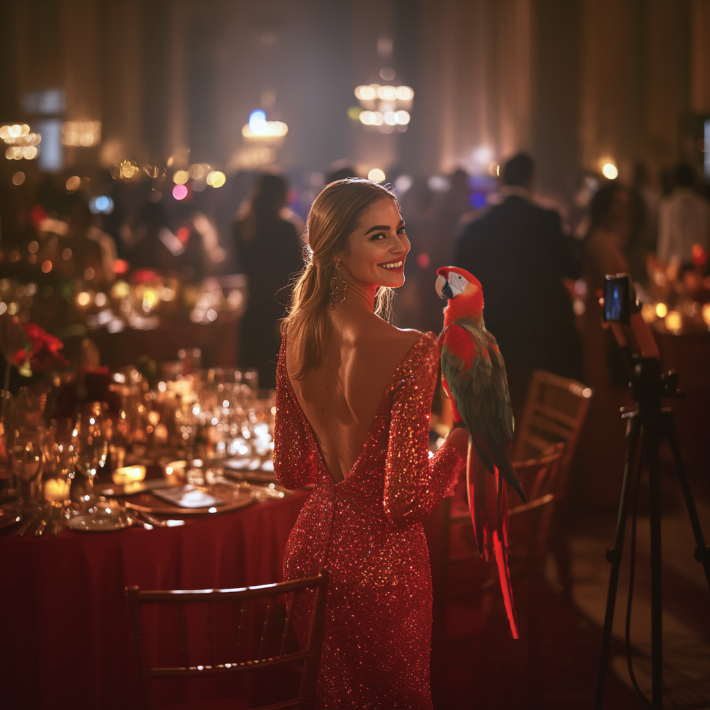Rainbow was perched on her shoulder. The parrot’s vibrant feathers caught every camera flash, and Marcy milked it for all it was worth.